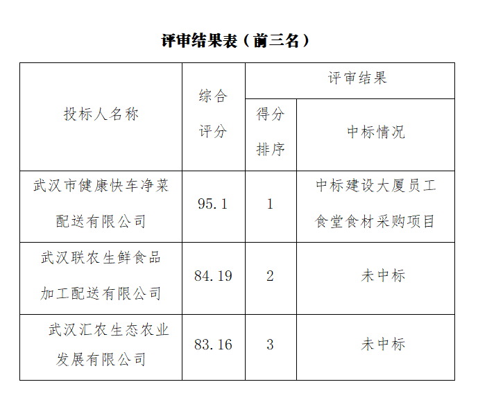 ? ? 經(jīng)評審,綜合評分排名第一為武漢市健康快車凈菜配送有限公司,綜合評分為95.1分,中標武漢市政工程設計研究院有限責任公司建設大廈員工食堂食材采購項目。