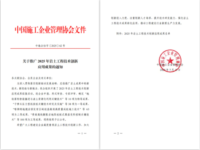 ? ? 近日,中國施工企業(yè)管理協(xié)會2025年巖土工程技術創(chuàng)新應用成果結果正式揭曉。經(jīng)過企業(yè)申報、形式審查、專家評審等多個環(huán)節(jié)遴選,武漢市政院巖土博士創(chuàng)新工作室申報的“深厚富水圓礫層基坑地下水控制特種技術”、“敏感環(huán)境地鐵盾構隧道穿越極硬巖特種技術”等2項技術創(chuàng)新性顯著,獲評為三等成果。
