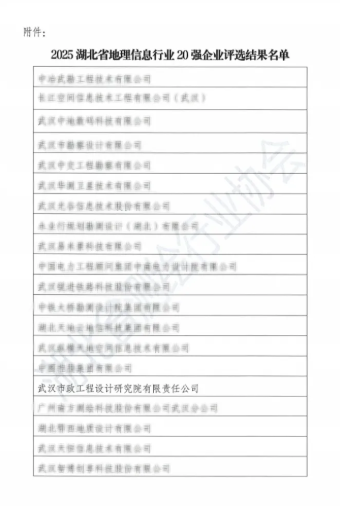 近日,從湖北省測繪行業(yè)協(xié)會傳來喜訊,武漢市政院憑借卓越的技術(shù)實力與行業(yè)貢獻,成功獲評“2025湖北省地理信息行業(yè)20強”。這一榮譽標志著公司在測繪地理信息領(lǐng)域的專業(yè)能力獲得省級權(quán)威認可,為企業(yè)發(fā)展里程碑再添濃墨重彩。