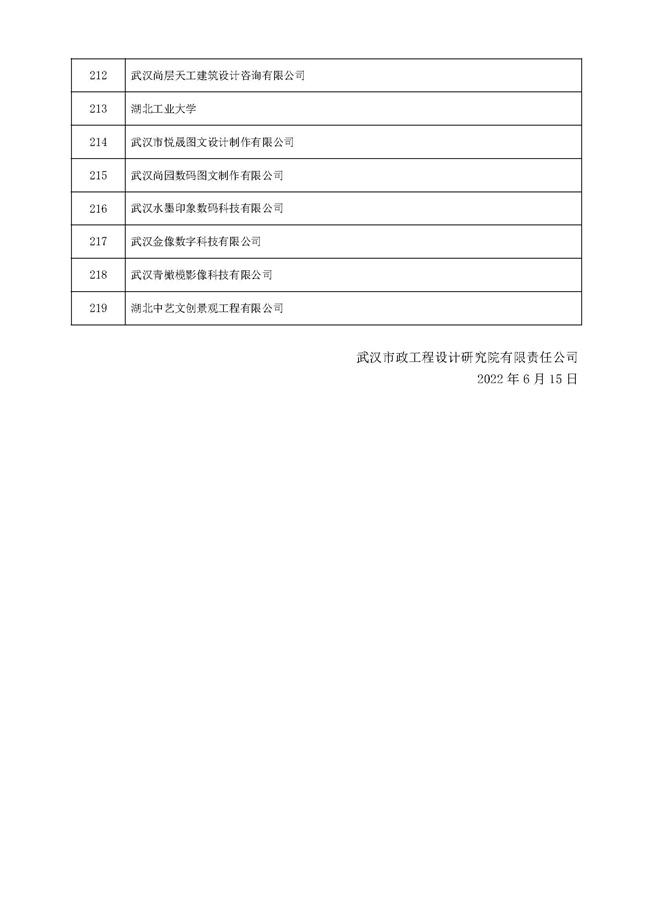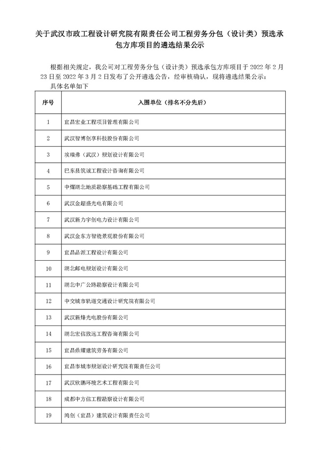 關(guān)于武漢市政工程設(shè)計研究院有限責任公司工程勞務(wù)分包(設(shè)計類)預(yù)選承包方庫項目的遴選結(jié)果公示