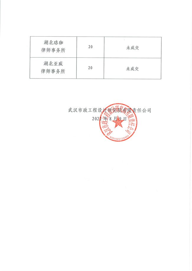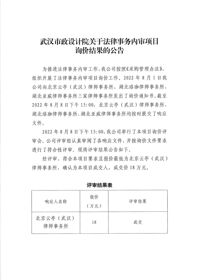 武漢市政設(shè)計(jì)院關(guān)于法律事務(wù)內(nèi)審項(xiàng)目詢價(jià)結(jié)果的公告
